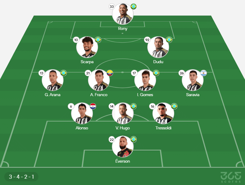 Escalação do Atlético-MG: Éverson; Ruan Tressoldi, Vitor Hugo e Júnior Alonso; Saravia, Igor Gomes, Alan Franco e Guilherme Arana; Scarpa e Dudu; Hulk.