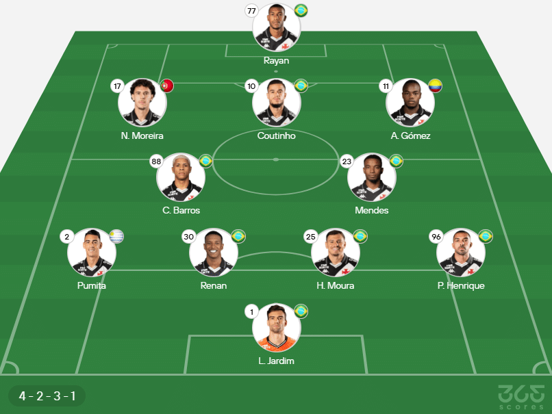 Escalação do Vasco: Léo Jardim; Paulo Henrique, Hugo Moura, Robert Renan e Pumita Rodríguez; Thiago Mendes e C. Barros; Andrés Gómez, Nuno Moreira e Coutinho; Rayan.