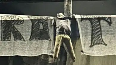 Duda Lima05/11/2024Torcida do Bahia usa faixas e boneco para protestar contra Rogério Ceni