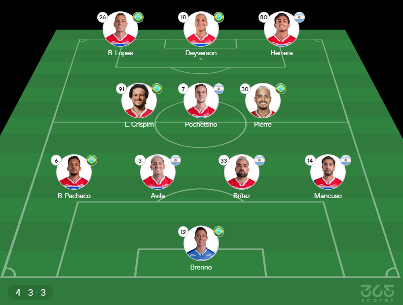 - Provável escalação do Fortaleza: Brenno; Mancuso, Brítez, Avila e Bruno Pacheco; Pierre, Pochettino e Lucas Crispim; Herrera, Deyverson e Breno Lopes