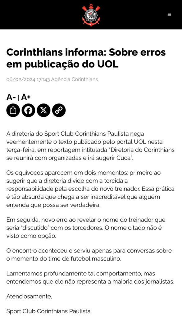 “Os equívocos aparecem em dois momentos: primeiro ao sugerir que a diretoria divide com a torcida a responsabilidade pela escolha do novo treinador. Essa prática é tão absurda que chega a ser inacreditável que alguém entenda que possa ser verdadeira. Em seguida, novo erro ao revelar o nome do treinador que seria “discutido” com os torcedores. O nome citado não é visto como opção”, afirmou o Timão.