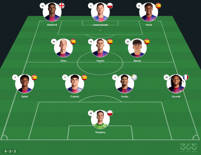 - Provável escalação do Barcelona: Szczesny; Koundé, Ronald Araújo, Cubarsí e Baldé; Bernal, Fermín López e Dani Olmo; Yamal, Lewandowski e Rashford