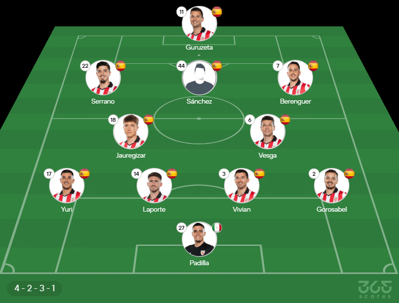 Provável escalação do Athletic Bilbao: Padilla; Gorosabel, Vivian, Laporte e Yuri; Vesga e Jauregizar; Berenguer, Sánchez e Serrano; Guruzeta. Técnico: Ernesto Valverde.