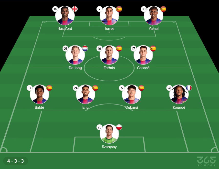 Escalação do Barcelona: Szczesny; Koundé, Cubarsí, Eric García, Baldé; Marc Casadó, Fermín López e Frenkie De Jong; Lamine Yamal, Marcus Rashfurd e Ferran Torres. Técnico: Hansi Flick.