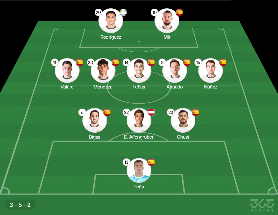 - Escalação do Elche: Peña, Chust, Affengruber e Bigas; Álvaro Núñez, Aguado, Febas, Mendoza e Valera; Mir e Álvaro Rodríguez