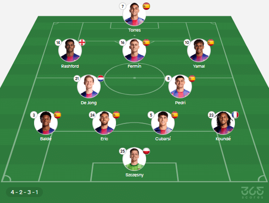 Provável escalação do Barcelona: Szczesny, Koundé, Cubarsí, García, Baldé; Pedri, De Jong, Yamal, Rashford, Fermín; Torres. Técnico: Hans-Dieter Flick