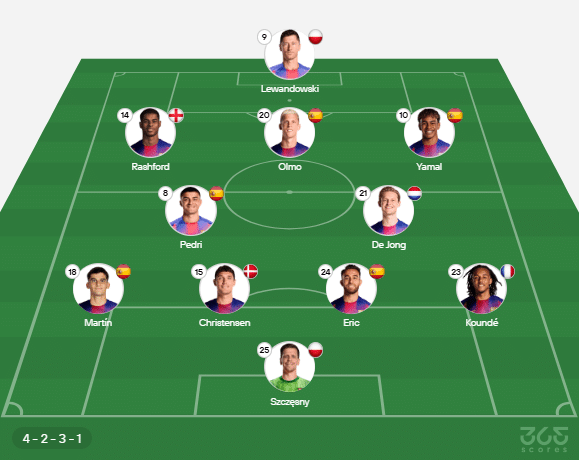 Provável escalação do Barcelona: Szcezesny, Koundé, Eric Garcia, Christensen, Martín; De Jong, Pedri, Yamal, Rashford, Olmo; Lewandowski. Técnico: Hans-Dieter Flick