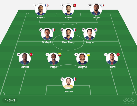 Provável escalação do PSG: Chevalier, Hakimi, Zabarnyi, Pacho, Mendes; Zaire-Emery, Kang-In Lee, Mayulu; Mbayem Barcola, Ramos. Técnico: Luis Enrique