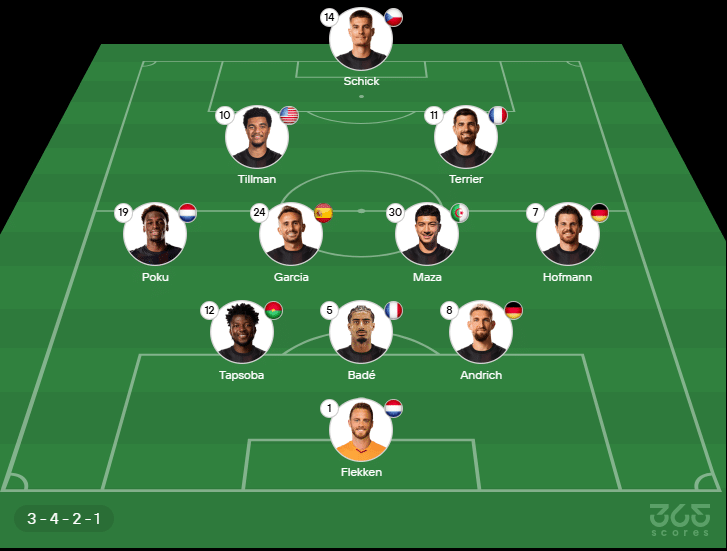 Provável escalação do Bayer Leverkusen: Flekken; Andrich, Badé, Tapsoba; Hofmann, Maza, Garcia, Poku; Terrier, Tillman; Schick. Técnico: Kasper Hjulmand