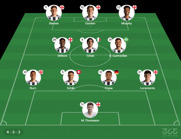 • Escalação do Newcastle: Thompson; Livramento, Thiaw, Schär, Burn; Tonali, Bruno Guimarães, Willock; Murphy, Barnes, Gordon