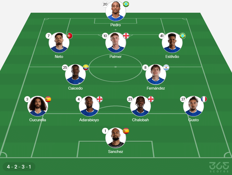 Provável escalação do Chelsea: Sanchez; Gusto, Chalobah, Adarabioyo e Cucurella; Caicedo e Enzo Fernández; Cole Palmer, Pedro Neto e Estêvão; João Pedro.