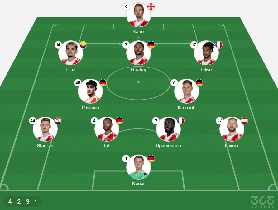 Provável escalação do Bayern de Munique: Neuer; Laimer, Upamecano, Tah e Stanisic; Kimmich e Pavlovic; Gnabry, Olise e Luis Díaz; Harry Kane.