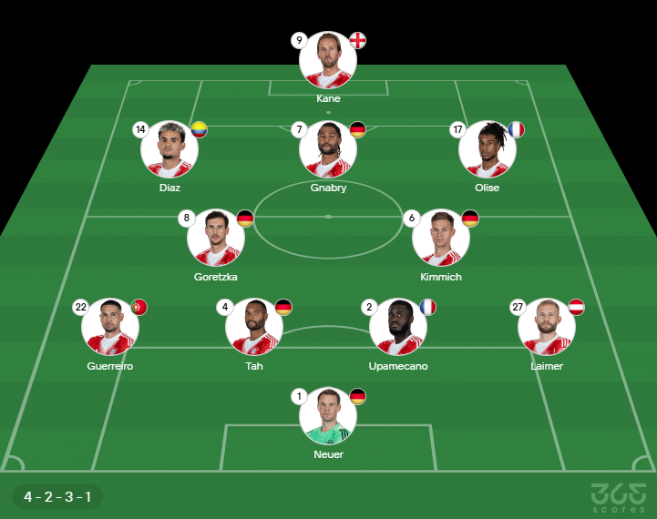 Provável escalação do Bayern de Munique: Neuer, Guerreiro, Tah, Upamecano e Laimer; Goretzka, Kimmich, Luis Díaz, Gnabry e Olise; Harry Kane. Técnico: Vincent Kompany.