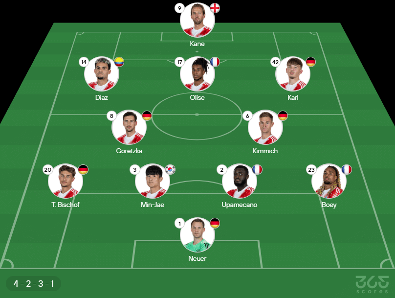 Provável escalação do Bayern de Munique: Neuer; Boey, Upamecano, Min-Jae e Bischof; Kimmich e Goretzka; Lennart Karl, Olise e Luis Díaz; Harry Kane. Técnico: Vincent Kompany.