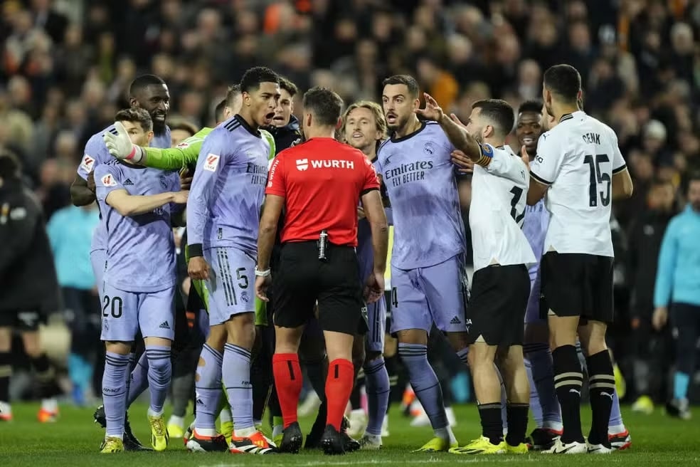 O lance polêmico aconteceu já no apagar das luzes, quando Gil Manzano permitiu que o Real Madrid cobrasse mais um escanteio antes do apito final. Fato é que a bola não saiu e o lance seguiu o suficiente para Jude Bellingham marcar. O gol, no entanto, não foi validado pois Jesus apitou o fim do jogo antes do cruzamento para a área. Uma confusão, então, foi instaurada em campo e Bellingham foi mais exaltado.