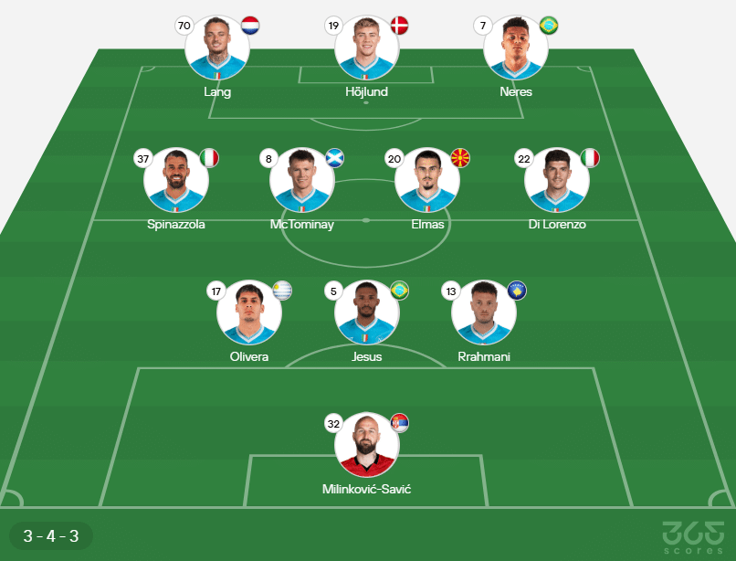 Escalação do Napoli: Milinkovic-Savic; Rrahmani, Juan Jesus e Olivera; Di Lorenzo, Elmas, Mc Tominay e Spinazzola; David Neres, Lang e Hojlund.