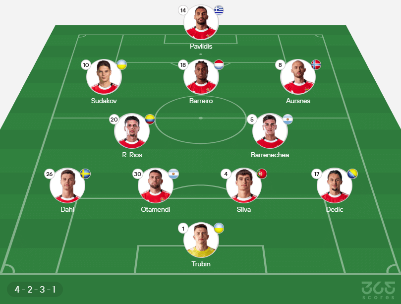 Escalação do Benfica: Trubin; Dedic, Antonio Silva, Otamendi e Dahl; Barrenechea e Richard Rios; Barreiro, Aursnes e Sudakov; Pavlidis.