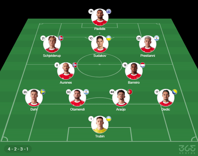 Escalação do Benfica: Trubin, Dedic, Tomás Araújo, Otamendi e Dahl; Barreiro, Aursnes, Prestianni, Sukadov e Schjelderup; Pavlidis. Técnico: José Mourinho.