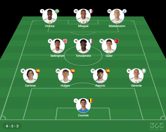 - Escalação do Real Madrid: Courtois, Valverde, Asencio, Huijsen e Carreras; Arda Güler, Tchouaméni e Bellingham; Mastantuono, Vini Jr e Mbappé