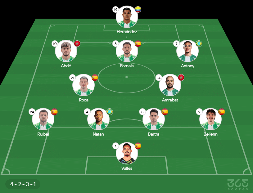 - Provável escalação do do Betis: Vallés; Bellerin, Bartra, Natan e Ruibal; Amrabat e Roca; Antony, Fornals e Abdé; Cucho Hernández