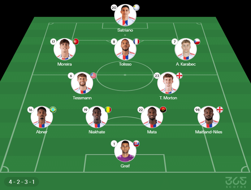 - Provável escalação do Lyon: Greif; Maitland-Niles, Mata, Niakhate e Abner; Morton e Tessmann; Karabec, Tolisso e Afonso Moreira; Satriano