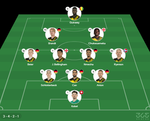 - Provável escalação do Borussia: Kobel; Anton, Can, Schloterbeck; Ryerson, Nmecha, J Bellingham, Beier; Chukwuemeka, Brandt, Guirassy