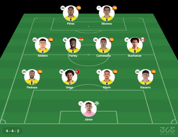 - Provável escalação do Villarreal: Júnior; Navarro, Marin, Veiga, Pedraza; Buchanan, Comesaña, Partey, Alberto Moleiro; Moreno, Pérez