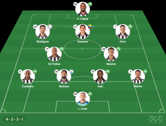 - Provável escalação do Botafogo: Léo Linck; Cuiabano, Barboza, Kaio Pantaleão e Vitinho; Marlon Freitas e Newton; Santi Rodríguez, Savarino e Artur; Arthur Cabral