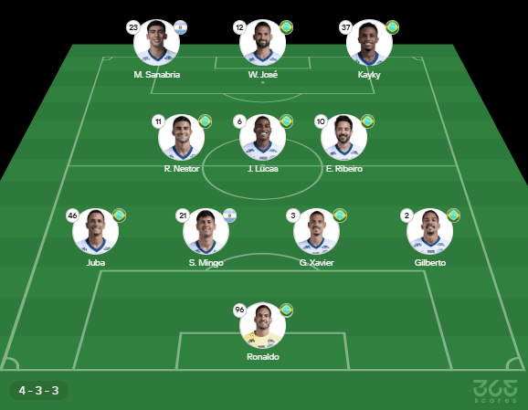 - Provável escalação do Bahia: Ronaldo; Luciano Juba, Santiago Mingo, Gabriel Xavier e Gilberto; Nestor, Jean Lucas e Everton Ribeiro; Sanabria, Willian José e Kayky