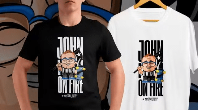 O Botafogo inovou em seus produtos e lançou nesta quinta-feira (18), uma camisa com a imagem de John Textor. As peças estão à venda no site da equipe, com a frase “John On Fire” (John pegando fogo, em tradução livre).