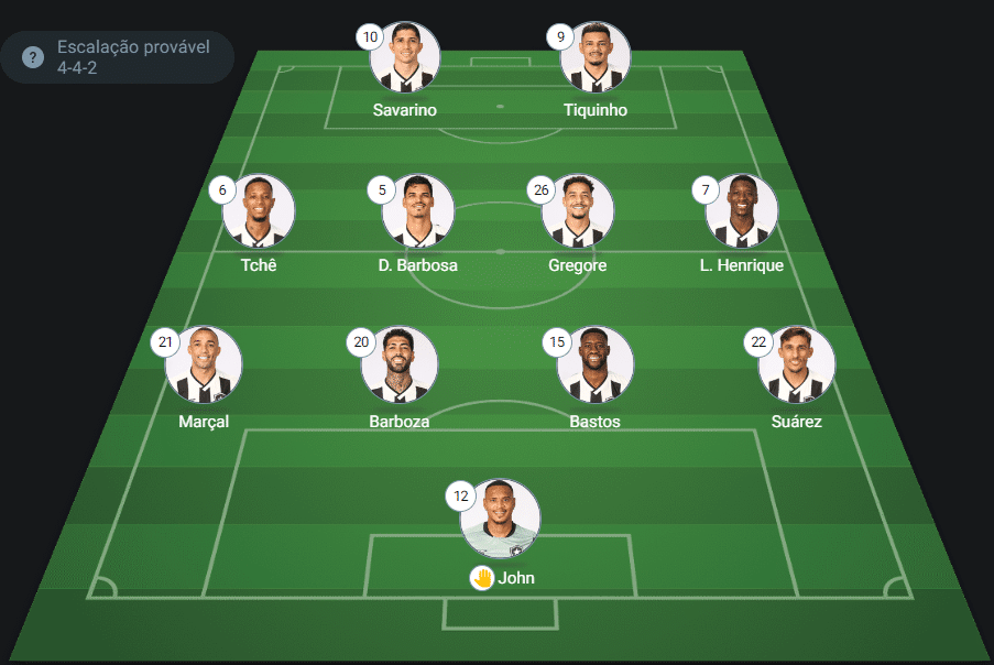 Provável escalação do Botafogo: John, Marçal, Barboza, Bastos e Suárez; Tchê Tchê, Danilo Barbosa, Gregore e Luiz Henrique; Savarino e Tiquinho. Treinador: Artur Jorge.