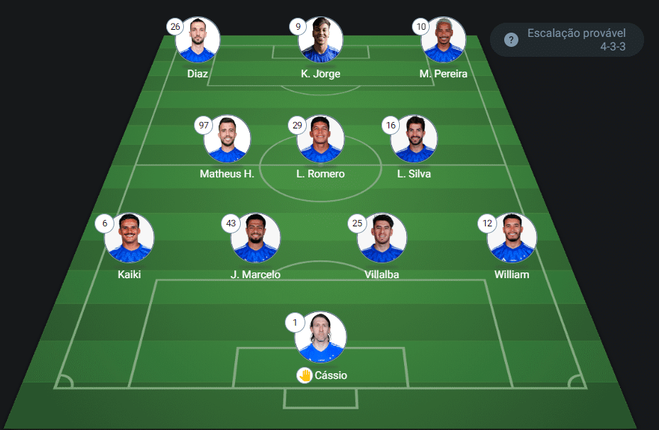 Provável escalação do Cruzeiro: Cássio, Kaiki, João Marcelo, Villabla e William; Matheus Henrique, Lucas Romero e Lucas Silva; Lautaro Diaz, Kaio Jorge e Matheus Pereira. Treinador: Fernando Seabra.