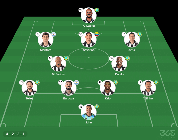 - Provável escalação do Botafogo: John, Alex Telles, Barboza, Kaio Pantaleão e Vitinho; Marlon Freitas, Danilo, Montoro, Savarino e Artur; Arthur Cabral