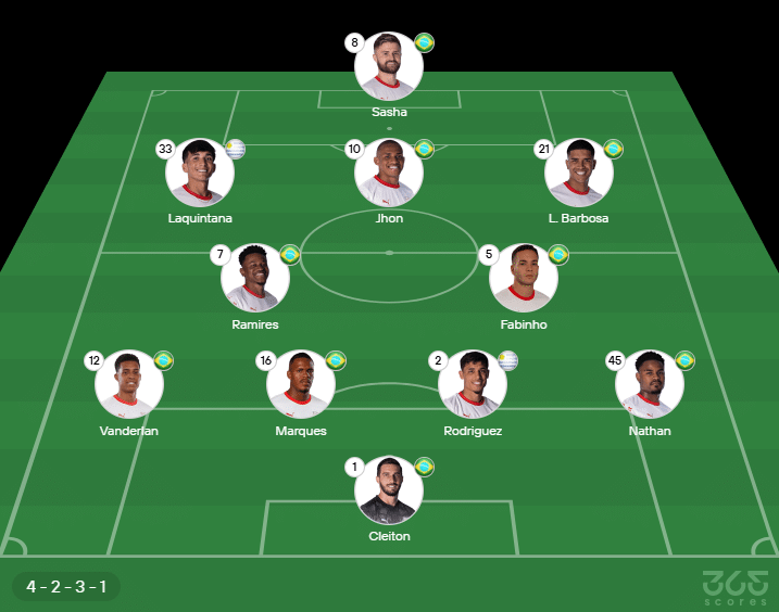 - Provável escalação do RB Bragantino: Cleiton, Vanderlan, Marques, Guzmán Rodríguez e Nathan; Ramires, Fabinho, Laquintana, Jhon Jhon e Lucas Barbosa; Eduardo Sasha