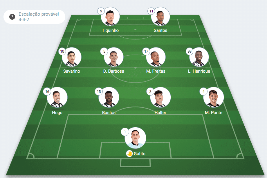 Provável escalação do Botafogo: Gatito; Mateo Ponte, Lucas Halter, Bastos, Hugo; Danilo Barbosa, Marlon Freitas, Savarino, Jeffinho; Júnior Santos, Tiquinho Soares.