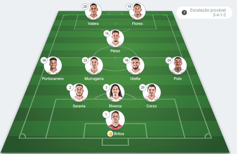 Provável escalação do Universitario: Britos; Corzo, Riveros, Saravia; Rodrigo Ureña, Murrugarra, Polo, Portocarrero, Pérez; Varela e Flores.