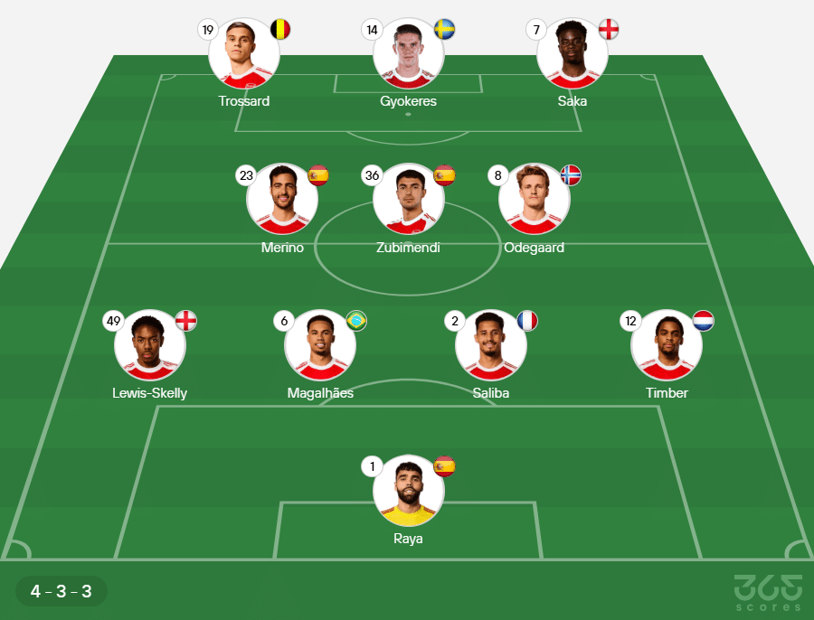 Escalação do Arsenal: David Raya; Timber, Saliba, Gabriel Magalhães e Lewis-Skelly; Zubimendi, Merino e Odegaard; Trossard, Bukayo Saka e Gyökeres.