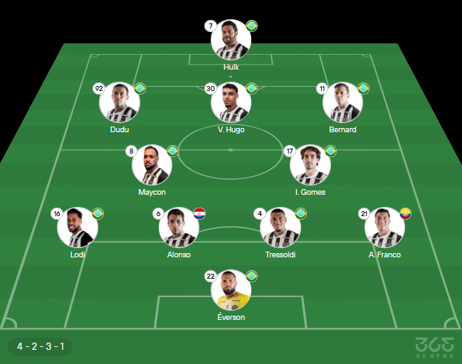 - Escalação do Atlético-MG: Éverson, Alan Franco, Tressoldi, Junior Alonso e Renan Lodi; Igor Gomes, Maycon, Bernard, Victor Hugo e Dudu; Hulk