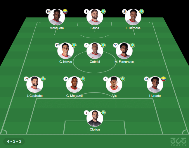 Escalação do RB Bragantino: Cleiton, Hurtado, Alix, Gustavo Marques e Juninho Capixaba; Matheus Fernandes, Gabriel e Gustavo Neves; Lucas Barbosa, Mosquera e Eduardo Sasha. Técnico: Vágner Mancini.