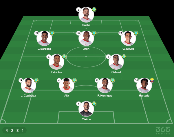 - Provável escalação do Bragantino: Cleiton; Hurtado, P. Henrique, Alix, Juninho Capixaba; Gabriel, Fabinho, Jhon; G. Neves, Lucas Barbosa, Sasha