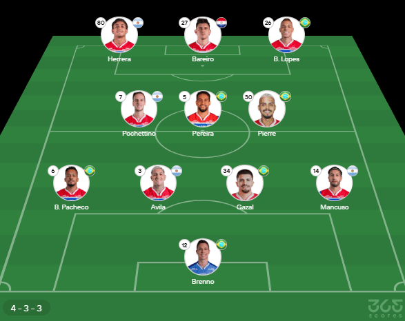 - Provável escalação do Fortaleza: Brenno; Mancuso, Gazal, Avila, B. Pacheco; Pierre, Pereira, Pochettino; Breno Lopes, Herrera, Bareiro