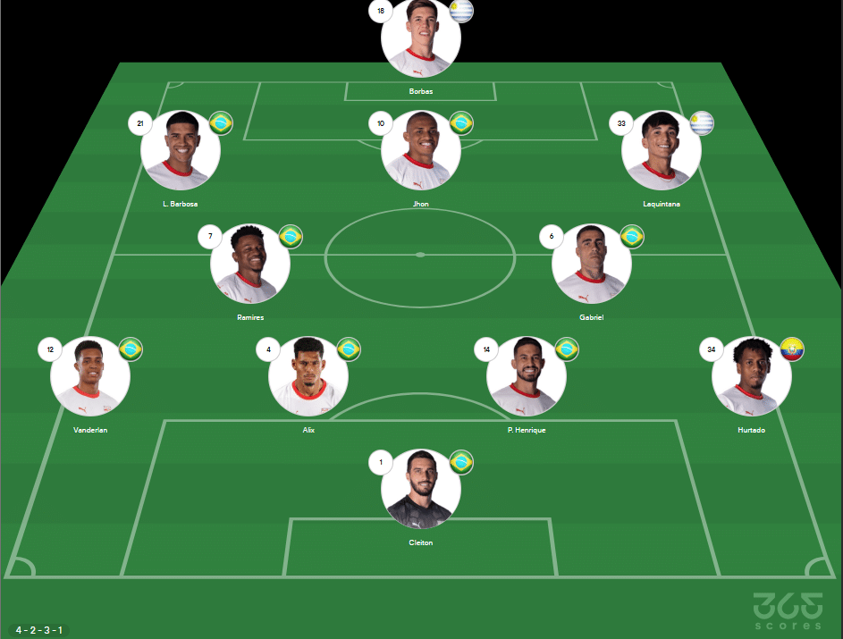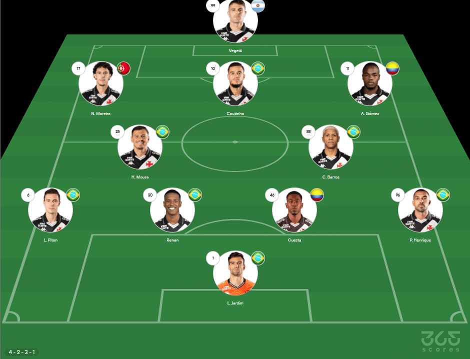 - Provável escalação do Vasco: Léo Jardim; Lucas Piton; Robert Renan, Carlos Cuesta e Paulo Henrique; Hugo Moura e Cauan Barros; Nuno Moreira, Coutinho e Andrés Gómez; Vegetti