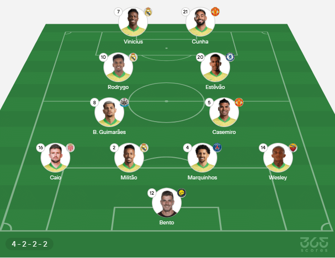 Escalação do Brasil: Bento, Wesley, Marquinhos, Éder Militão e Caio Henrique; Casemiro, Bruno Guimarães, Estêvão, Rodrygo; Matheus Cunha e Vini Jr. Técnico: Carlo Ancelotti.