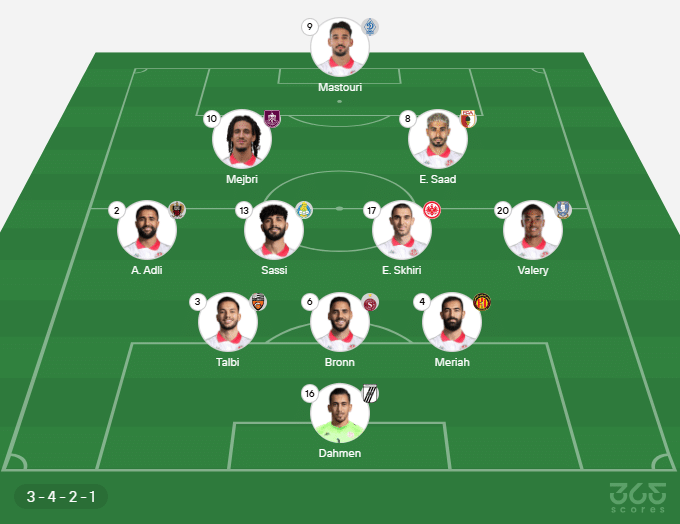 - Escalação da Tunísia: Dahmen, Valery, Meriah, Bronn, Talbi, e Adli; Skhiri, Sassi, Mejbri e Saad; Mastouri