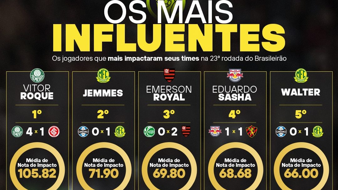 Como resultado, Vitor Roque acabou sendo também o jogador mais impactante da 23ª rodada do Campeonato Brasileiro. O atacante do Palmeiras teve uma Nota de Impacto (NI) de 105.82 no 365Scores.