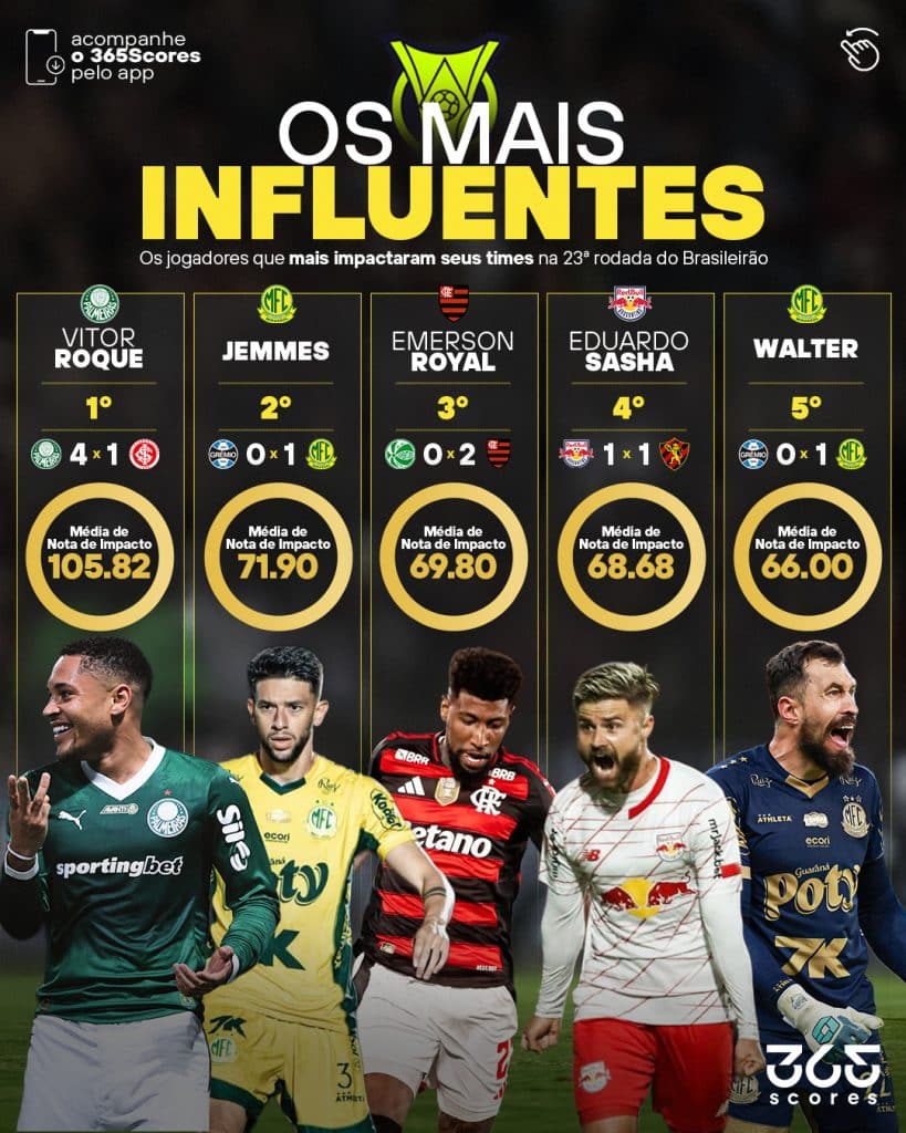 Como resultado, Vitor Roque acabou sendo também o jogador mais impactante da 23ª rodada do Campeonato Brasileiro. O atacante do Palmeiras teve uma Nota de Impacto (NI) de 105.82 no 365Scores.