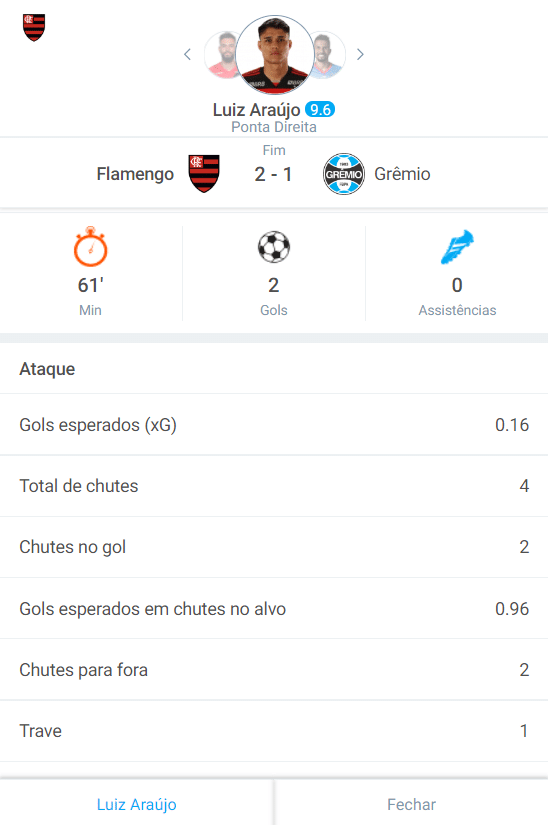 Em 61 minutos, o jogador marcou os dois gols da vitória do Flamengo, além de acertar a trave em uma oportunidade.