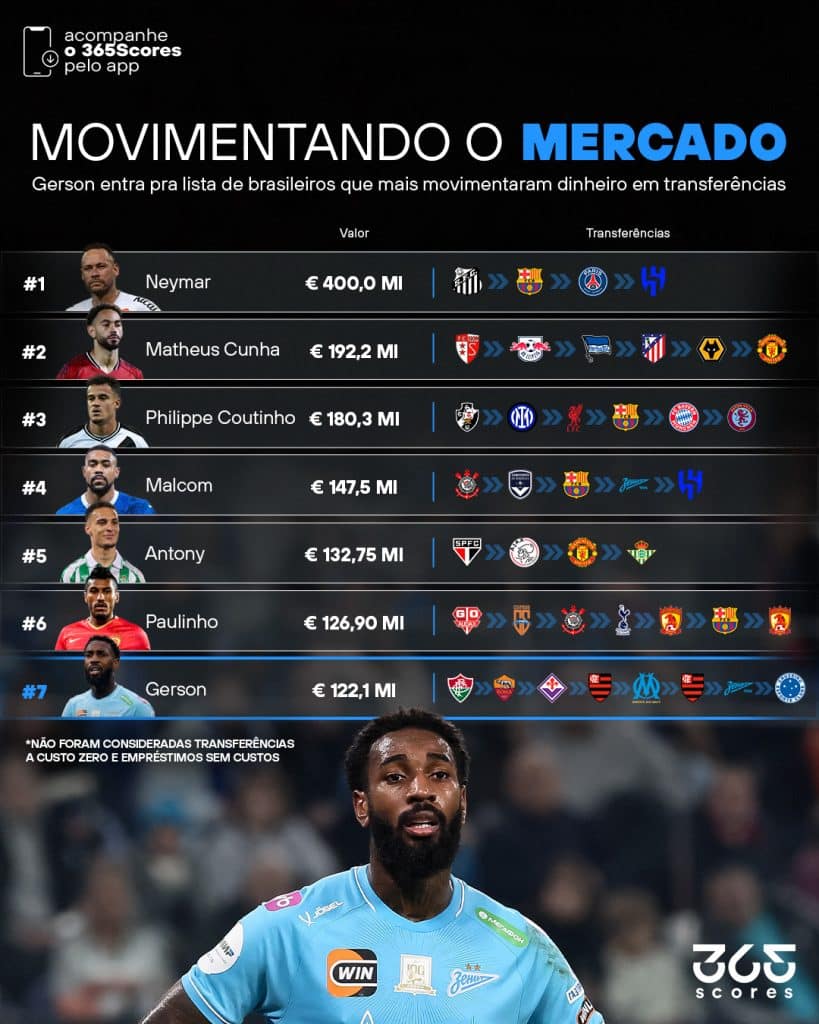Segundo levantamento do 365Scores, o ranking dos brasileiros que mais dinheiro movimentaram em transferências acaba de ganhar um novo integrante de peso: Gerson.