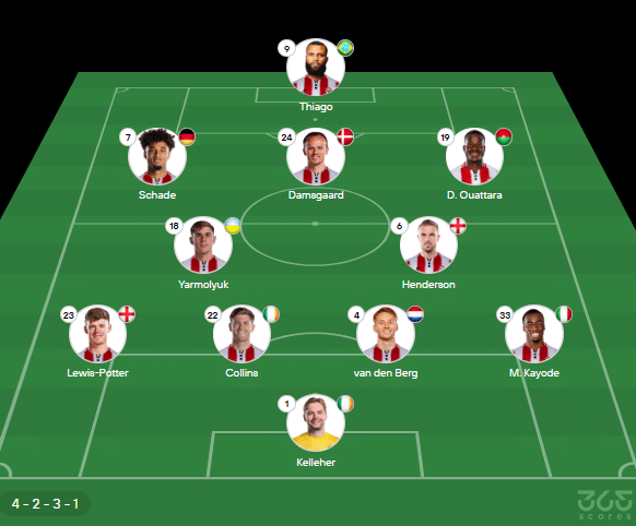 - Provável escalação da Brentford: Kelleher; Kayoade, van den Berg, Colona, Lewis-Potter; Henderson, Yarmolyuk, Damsgaard; Ouattara, Schade, Thiago.