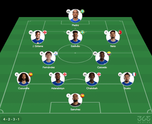 Provável escalação do Chelsea: Sanchez; Gusto, Chalobah, Adarabioyo, Cucurella; Caicedo, Fernández, Estêvão; Neto, Gittens, Pedro. Técnico: Enzo Maresca